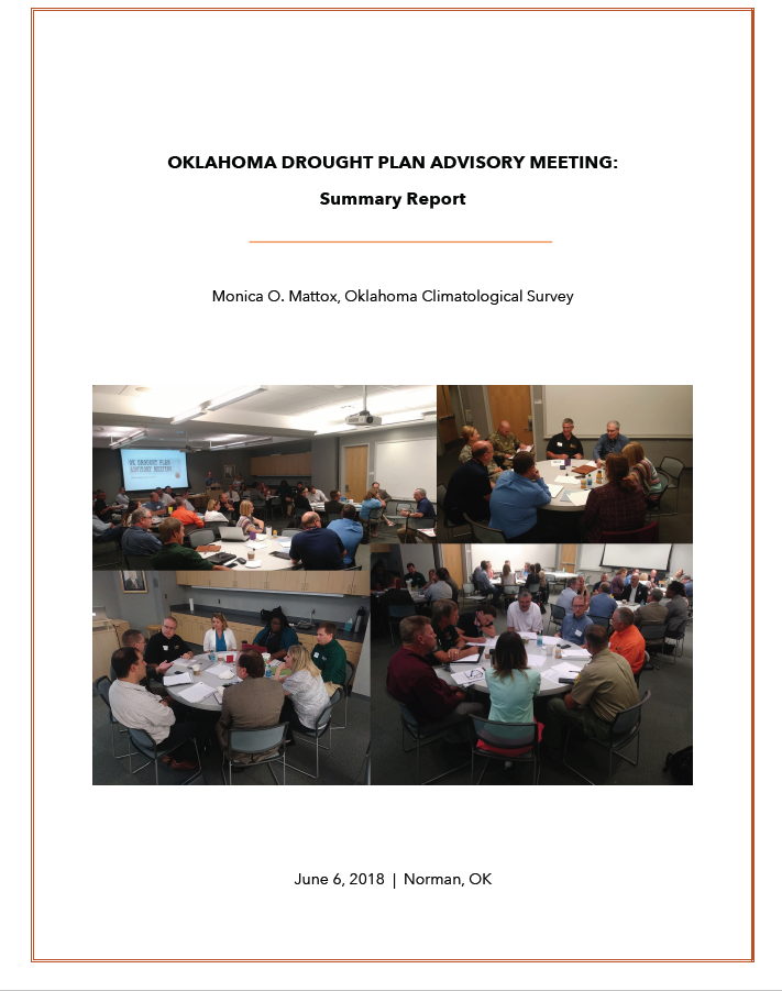 In June 2018, the Oklahoma Climatological Survey, with the support of SCIPP and NIDIS, hosted an Oklahoma Drought Plan Advisory Meeting. The aim of the meeting was to discuss strategies for updating the 1997 Oklahoma Drought Response Plan. In attendance were representatives from various state agencies and sectors. This summary report details key findings from the meeting, including discussions that centered around the 1997 plan, drought monitoring, communication, response, collaboration, and suggestions for the updated plan.