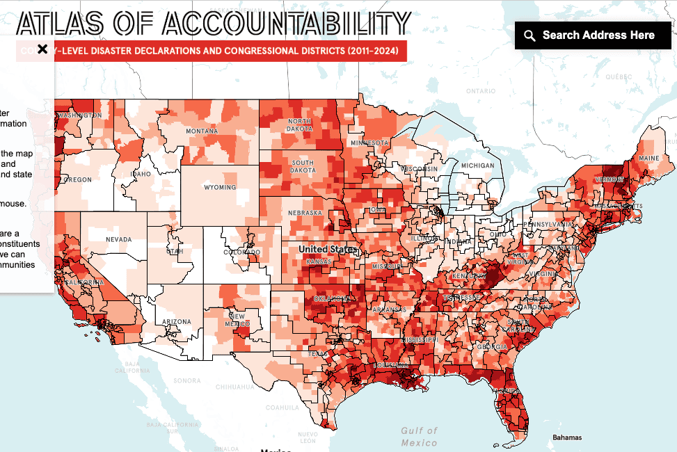 (2011-2024)Rebuild by Design - Institute for Public Knowledge, New York UniversityThe Atlas of Disaster and Accountability page includes an interactive map of the county-level major disaster declaration and post-disaster federal funding. After you click the county of interest, you can access the state-level Atlas of Disaster report that provides a page of statistics relating to disaster declarations, post-disaster funding, counties most impacted, population with high social vulnerability, and more for 2011-2024. Maps with some of this information is also provided, as well as a detailed table with FEMA funding obligations from disasters per county.