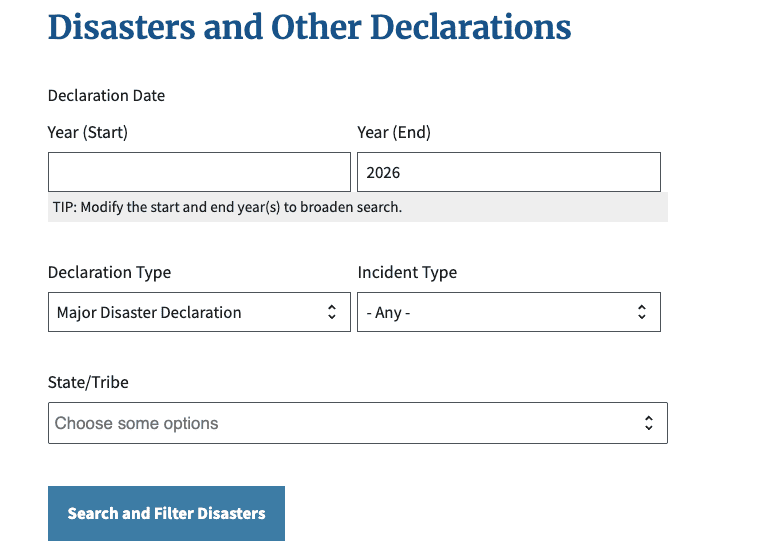 (1953-present)Federal Emergency Management AgencyThis page allows users to search for FEMA disaster declarations for a range of years and by incident type and state/tribe.
