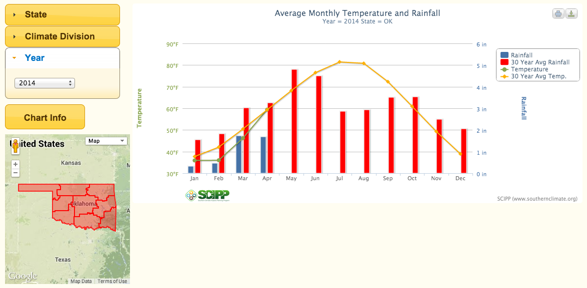 This tool displays information on how a particular year’s temperature or precipitation values compare to normal (i.e., 30-year average for the period 1991-2020). Users can view the information in a graph format by climate division for any state in the United States. A mouse-over function allows the user to view monthly values.